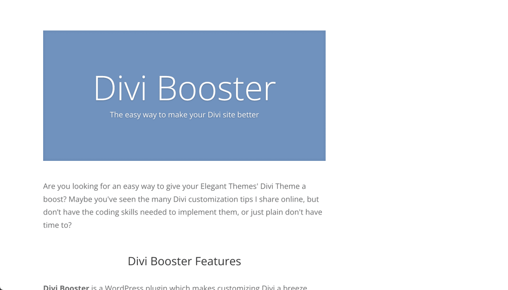 Divi Booster adalah plugin WordPress yang dirancang untuk pengguna Tema Divi Tema Elegan. Ini memberikan cara sederhana dan mudah untuk menyesuaikan dan meningkatkan tampilan dan fungsionalitas situs web berbasis Divi Anda. Dengan ratusan opsi konfigurasi baru, Divi Booster memungkinkan Anda mengubah tampilan dan perilaku situs web Anda hanya dalam beberapa klik, tanpa perlu mengetahui keahlian pengkodean apa pun.