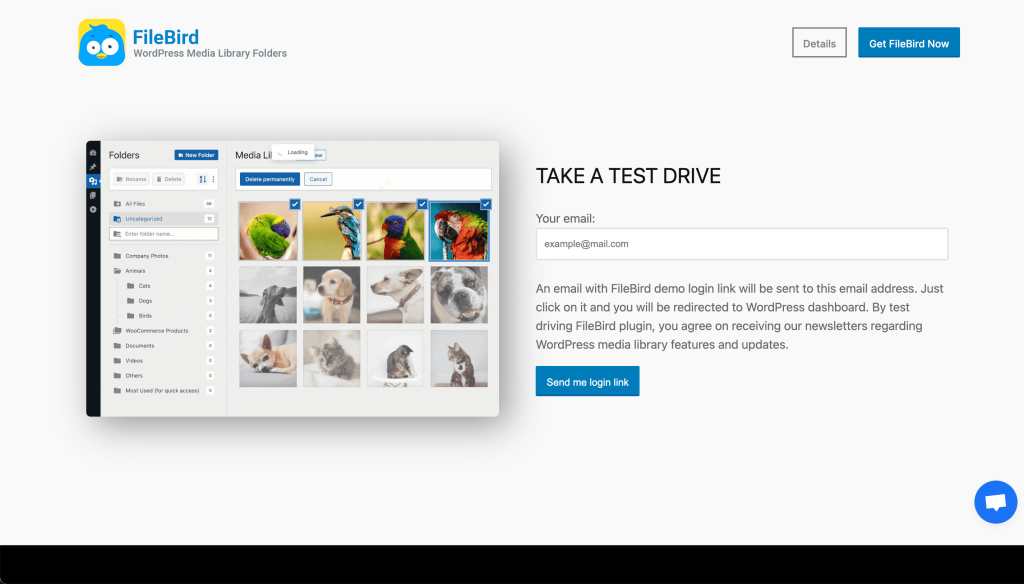 FileBird adalah plugin gratis dan FileBird Pro adalah versi berbayar, yang memungkinkan Anda menghemat waktu dalam manajemen media WP, mencari file & folder apa pun, memilahnya, menambahkan unduhan galeri gambar produk/mengekspor folder media, dll.